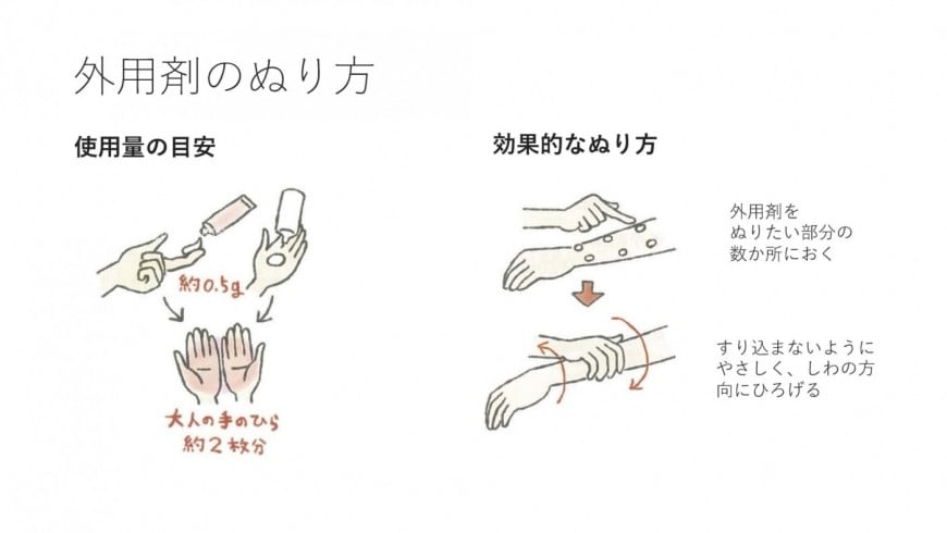 - これから塗ろうとする皮膚病変に、塗り薬を数か所に分けて置いて、皮膚のシワの方向にやさしく伸ばしましょう。ゴシゴシと擦り込むと、痒みがよけいに強くなったり皮膚を傷つけます。