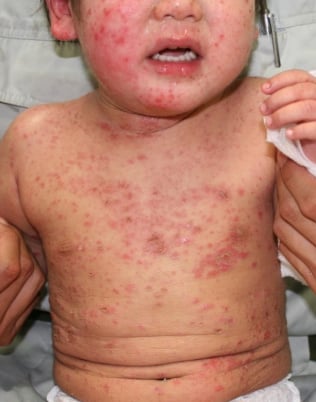 数日間で広がる皮膚の発疹・ただれ(いつもの塗り薬が効かない!)や腫れがあれば、早めに受診して治療を受けましょう(写真:アトピー性皮膚炎に合併したとびひ)。悪化すると、切開して中の膿を出したり、数日間の抗菌薬点滴が必要になるケースもあります。