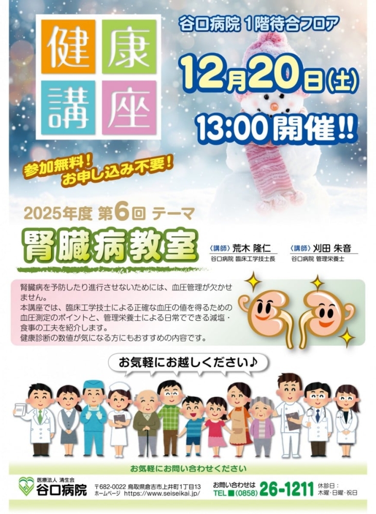 令和7年12月20日(土)13:00~より、谷口病院1階待合フロアにて、2025年度第6回健康講座を開催いたします。
