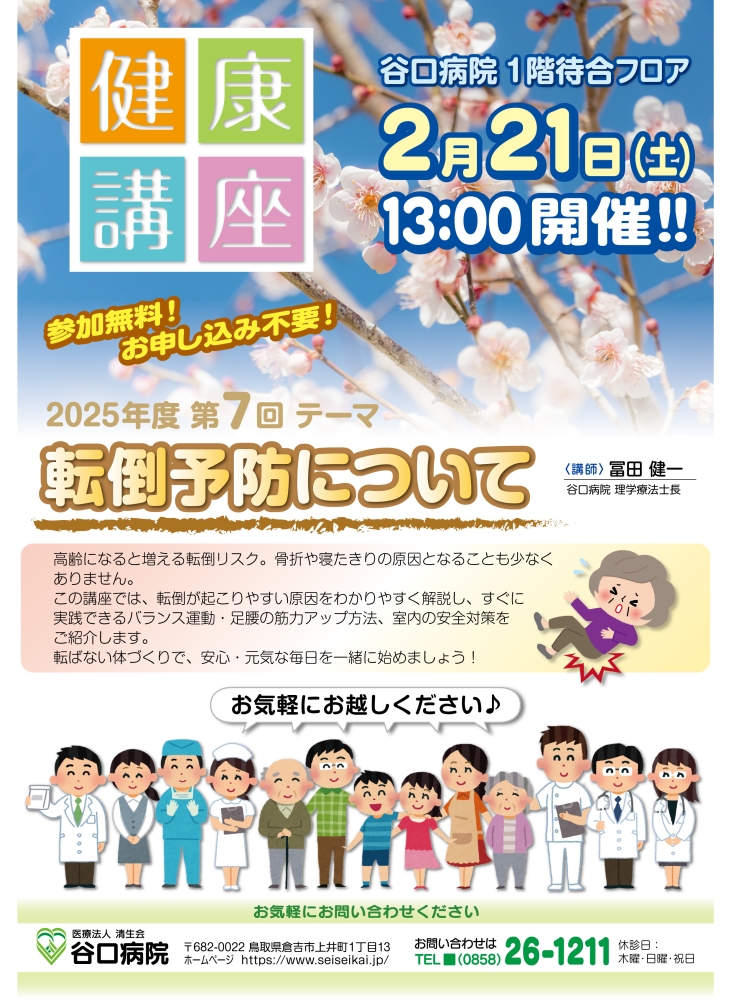 令和8年2月21日(土)13:00~より、谷口病院1階待合フロアにて、2025年度第7回健康講座を開催いたします。