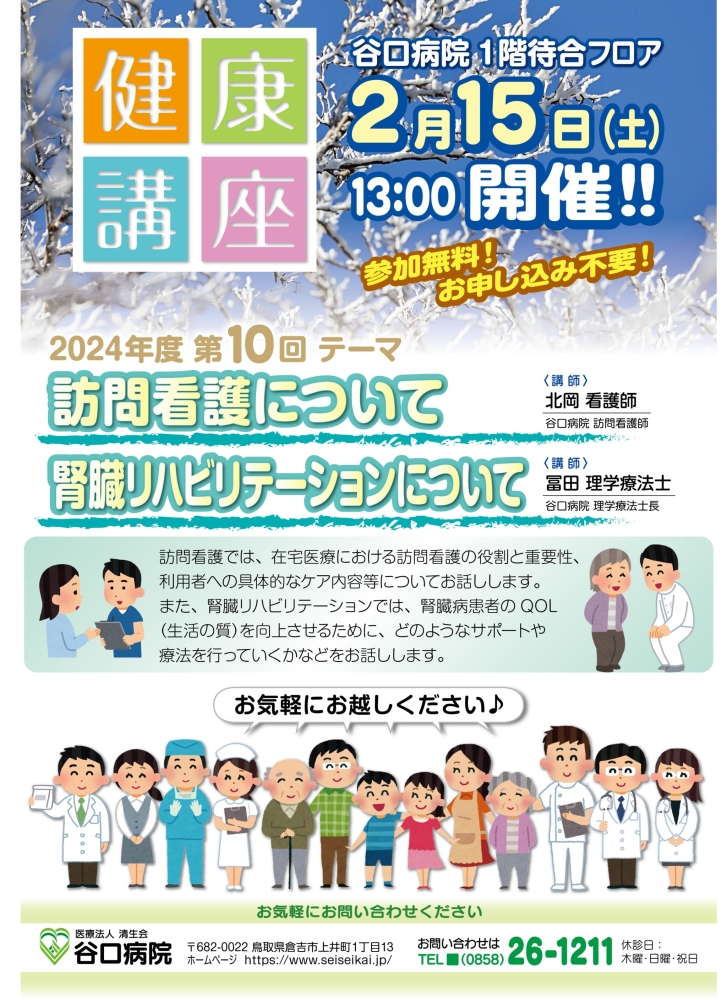 令和7年2月15日(土)13:00~より、谷口病院1階待合フロアにて、2024年度第10回健康講座を開催いたします。