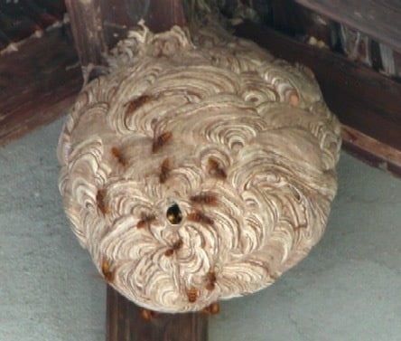 • 蜂や巣を刺激しない、近寄らない。家屋内や庭に巣を作らせない(写真①、②)。シーズン前に家の周りを見回って、巣があれば業者へ駆除を依頼する。